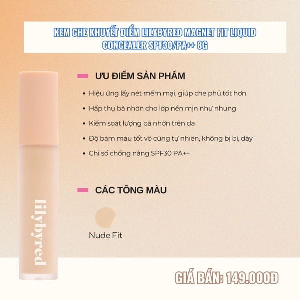 Kem Che Khuyết Điểm Lilybyred Magnet Fit Liquid Concealer SPF30/PA++ là kem che khuyết điểm thuộc thương hiệu Lilybyred với khả năng che phủ hoàn hảo các loại khuyết điểm khác nhau, kết cấu mịn nhẹ tự nhiên, dễ tán giúp bạn duy trì làn da mịn nhẹ như nhung, hoàn hảo không tì vết.