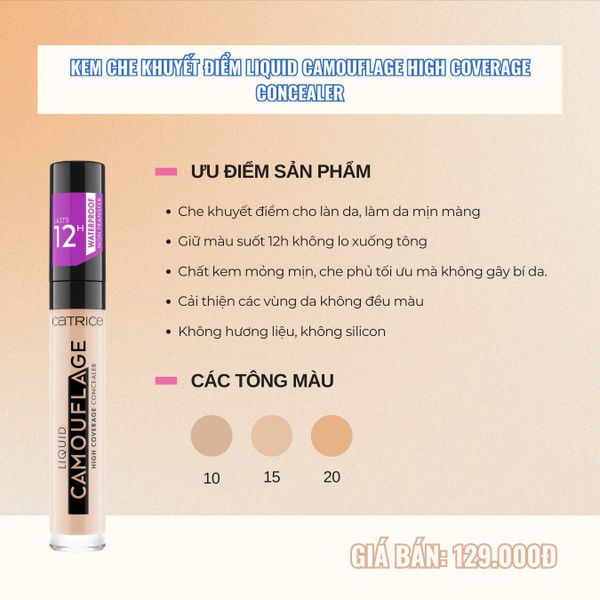 Kem Che Khuyết Điểm Catrice Liquid Camouflage High Coverage Concealer là che khuyết điểm thuộc thương hiệu Catrice. Với khả năng che phủ những khuyết điểm trên da như quầng thâm, thâm nám, vết mẩn đỏ tốt. Ngoài ra, có thành phần khóa ẩm cho da luôn mướt mịn, không bị mất đi độ ẩm trên da, chống thấm nước, không lem, không trôi lớp nền giúp giữ lớp nền đẹp suốt nhiều giờ liền.