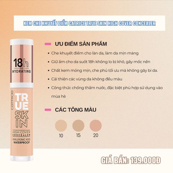 Kem Che Khuyết Điểm 18H Catrice True Skin High Cover Concealer với công thức có chứa hyaluronic acid sẽ giúp giữ ẩm cho làn da luôn mềm mại lên đến 18 giờ đồng hồ, đồng thời giúp làm mờ các khuyết điểm trên da, che giấu vết mụn và vết mẩn đỏ mà không gây bít tắc lỗ chân lông và không gây mụn khi sử dụng, mang lại lớp nền trang điểm mềm mịn, tự nhiên và lâu trôi.