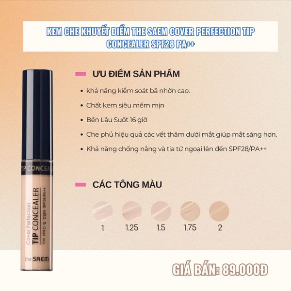 Kem Che Khuyết Điểm Có Chống Nắng Hàn Quốc The Saem Cover Perfection Tip Concealer SPF28/PA++ là che khuyết điểm với khả năng che phủ cao giúp che hiệu quả các đốm tàn nhang, sẹo do mụn hay các đầu mụn bị ửng đỏ trên da, hiệu chỉnh tông màu da mang đến cho bạn lớp nền chuẩn không tì vết thuộc thương hiệu The Saem đến từ Hàn Quốc.
