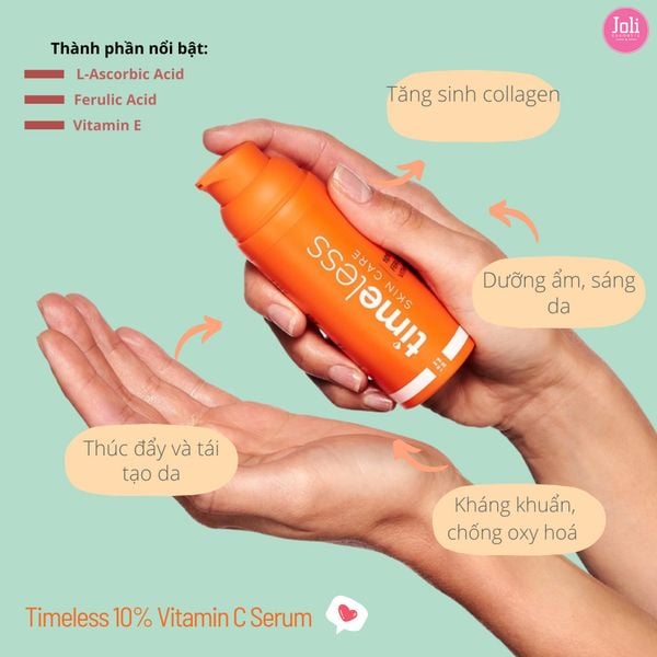 Serum Timeless 10% Vitamin C Sáng Da, Mờ Vết Thâm 30ml là dòng tinh chất đến từ thương hiệu mỹ phẩm Timeless của Mỹ, với các thành phần 10% L-Ascorbic Acid, Vitamin E và Ferulic Acid giúp dưỡng ẩm, sáng da, tăng khả năng chống oxy hóa, tăng sinh collagen. Sản phẩm phù hợp với làn da nhạy cảm, mới bắt đầu dùng vitamin C.