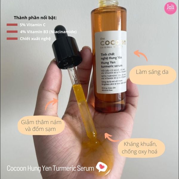 Tinh Chất Cocoon Chiết Xuất Từ Nghệ Hưng Yên 30ml là dòng tinh chất dưỡng da đến từ thương hiệu mỹ phẩm thuần chay Cocoon của Việt Nam, với thành phần dầu nghệ chiết xuất từ củ nghệ Hưng Yên rất giàu turmerone, được xé nhỏ và lơ lửng trong một hỗn hợp kết cấu mọng nước chứa 10% vitamin C (3-O-Ethyl Ascorbic Acid), 4% vitamin B3 và 2% NAG. Sản phẩm có tác dụng làm sáng, làm mờ vết thâm sạm, cung cấp độ ẩm, tăng cường độ đàn hồi, săn chắc đồng thời có khả năng chống oxy hoá cao và ngăn ngừa lão hoá.