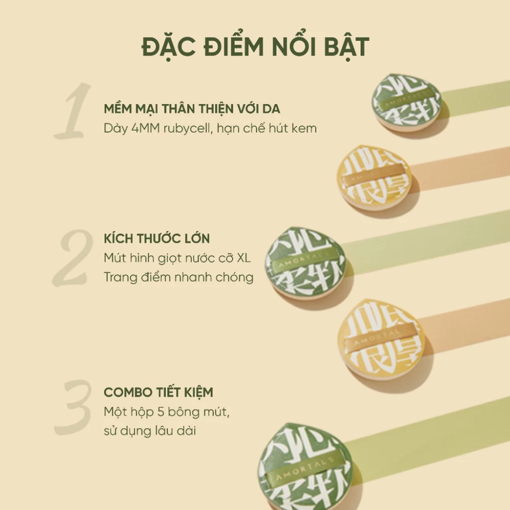 Bộ 5 Bông Mút Amortals Bonus Points Powder Puff Combo Pack (thường được gọi là bộ mút đen/vàng XL) là set phụ kiện trang điểm chuyên dụng để tán kem nền, phấn nước (cushion) và phấn phủ. Sản phẩm nổi bật với chất liệu Rubycell cao cấp giúp lớp nền mịn màng, tự nhiên và hạn chế tối đa tình trạng "hút" kem nền.