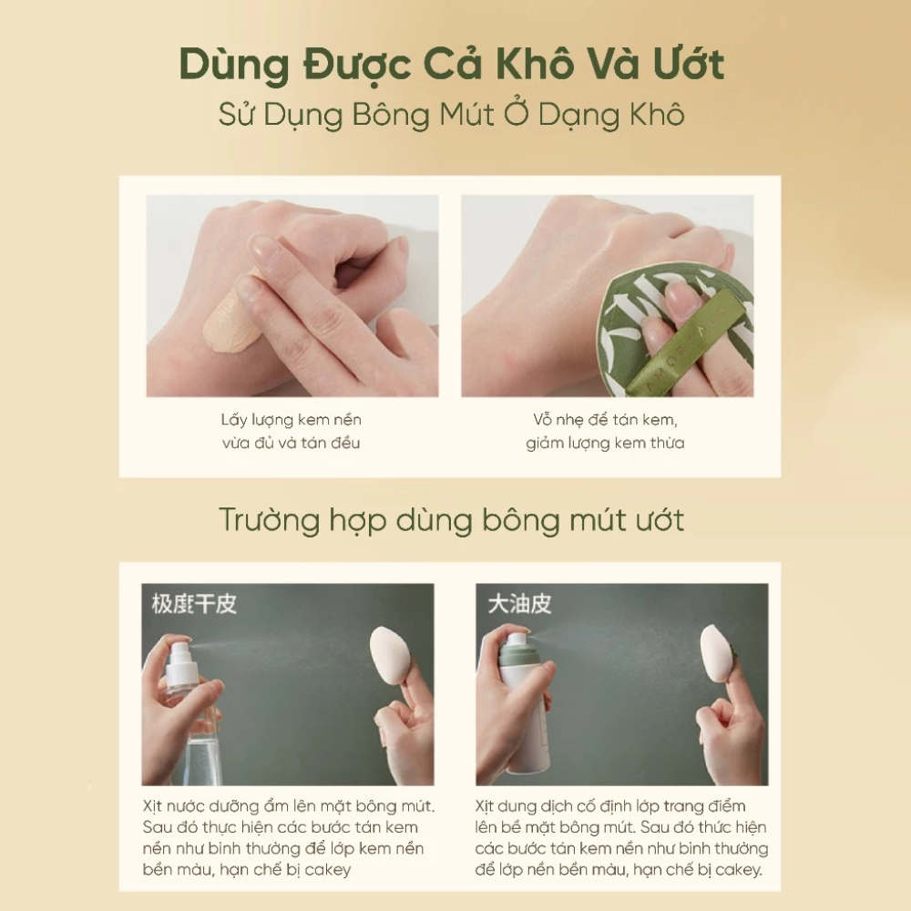 Đa năng: Có thể sử dụng khô để phủ phấn hoặc dùng ướt để tán các loại kem nền dạng lỏng, cushion, giúp lớp nền bám tốt và mỏng nhẹ.