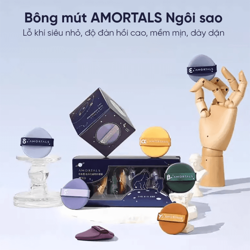 Bộ 7 Bông Mút Trang Điểm Hình Ánh Sao của nhà Amortals gồm 7 bông mút mềm mịn, kích thước nhỏ gọn phù hợp tán nền, phủ phấn hoặc che khuyết điểm. Chất liệu dẻo dai, đàn hồi tốt, giúp lớp nền mịn đều, tự nhiên. Dùng được cả khô và ướt, tiện lợi cho trang điểm hằng ngày hoặc mang theo khi di chuyển.