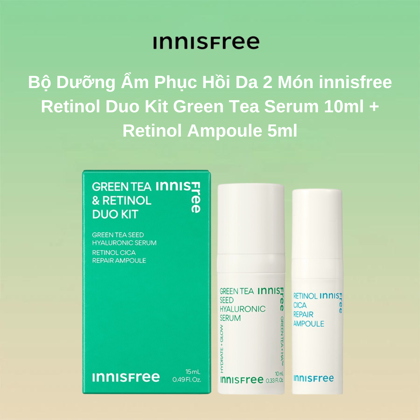 Bộ dưỡng ẩm phục hồi da 2 món Innisfree Retinol Duo Kit là giải pháp hoàn hảo cho làn da cần được tái tạo và phục hồi. Sản phẩm kết hợp giữa tinh chất trà xanh và Retinol, hai thành phần mạnh mẽ giúp cung cấp dưỡng chất và làm sáng da, giúp da trở nên mềm mại, đàn hồi và tươi trẻ hơn.