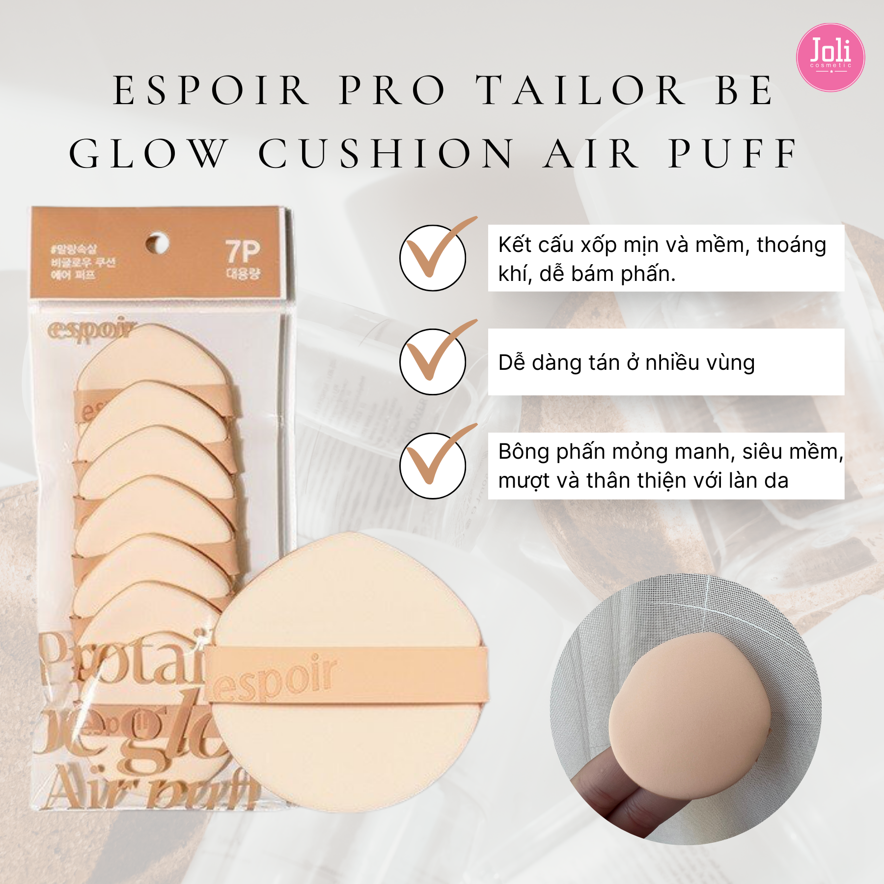 Kết cấu xốp mịn và mềm, thoáng khí, dễ bám phấn.