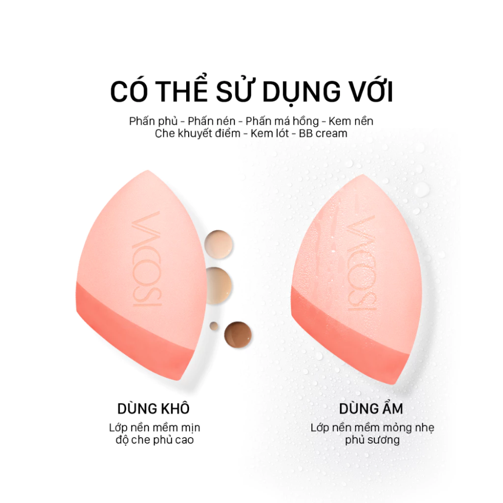 Bông vát xéo phủ Silicone Vacosi Pro-Crafted Makeup PH06 là sự kết hợp độc đáo trên 2 nền chất liệu Hydrophilic & Vegan Silicone. (Bông mút phủ Silicone) cùng công nghệ X2 BOUNCY kết cấu đàn hồi mềm mại để lớp nền căng mướt. Thiết kế đầu nhọn dàn trải kem nền len lỏi đến những góc cạnh trên khuôn mặt. Chất liệu Hydrophilic giúp bông “ngậm” định lượng nước và điều chỉnh theo ý đồ của người dùng: lớp nền căng mướt, lớp nền che phủ, cố định nền…