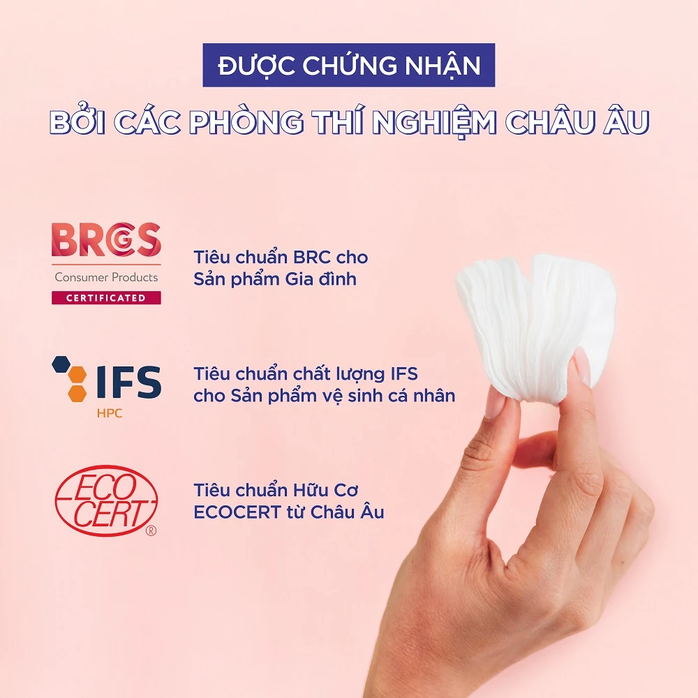 Bông không sử dụng keo hóa học nên rất an toàn khi sử dụng trên da nhạy cảm. Viền xung quanh miếng bông được dập rất kỹ lưỡng nên không gây ra việc tách đôi miếng bông khi đang sử dụng