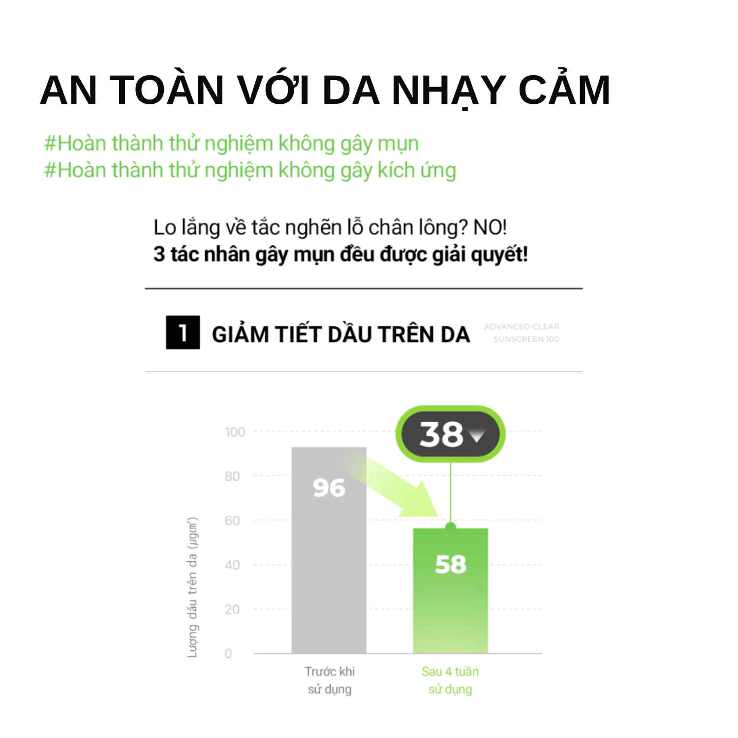 Kem Chống Nắng Cell Fusion C Advanced Clear Sunscreen 100 SPF 50+ /PA++++ ngoài có 2 nhóm màng lọc vật lí và hóa học cơ bản, còn có thêm màng lọc Iron Oxide. Đây vừa là thành phần tạo màu giúp kem chống nắng che phủ tốt hơn, vừa là màng lọc giúp lọc ánh sáng xanh để bảo vệ da tối ưu hơn. Tất nhiên, để phù hợp cho da dầu Cell Fusion C Advanced Clear Sunscreen 100 SPF50 cũng sử dụng các thành phần giúp kiểm soát dầu nhờn tối ưu như Niacinamide mà không làm bít tắc lỗ chân lông.