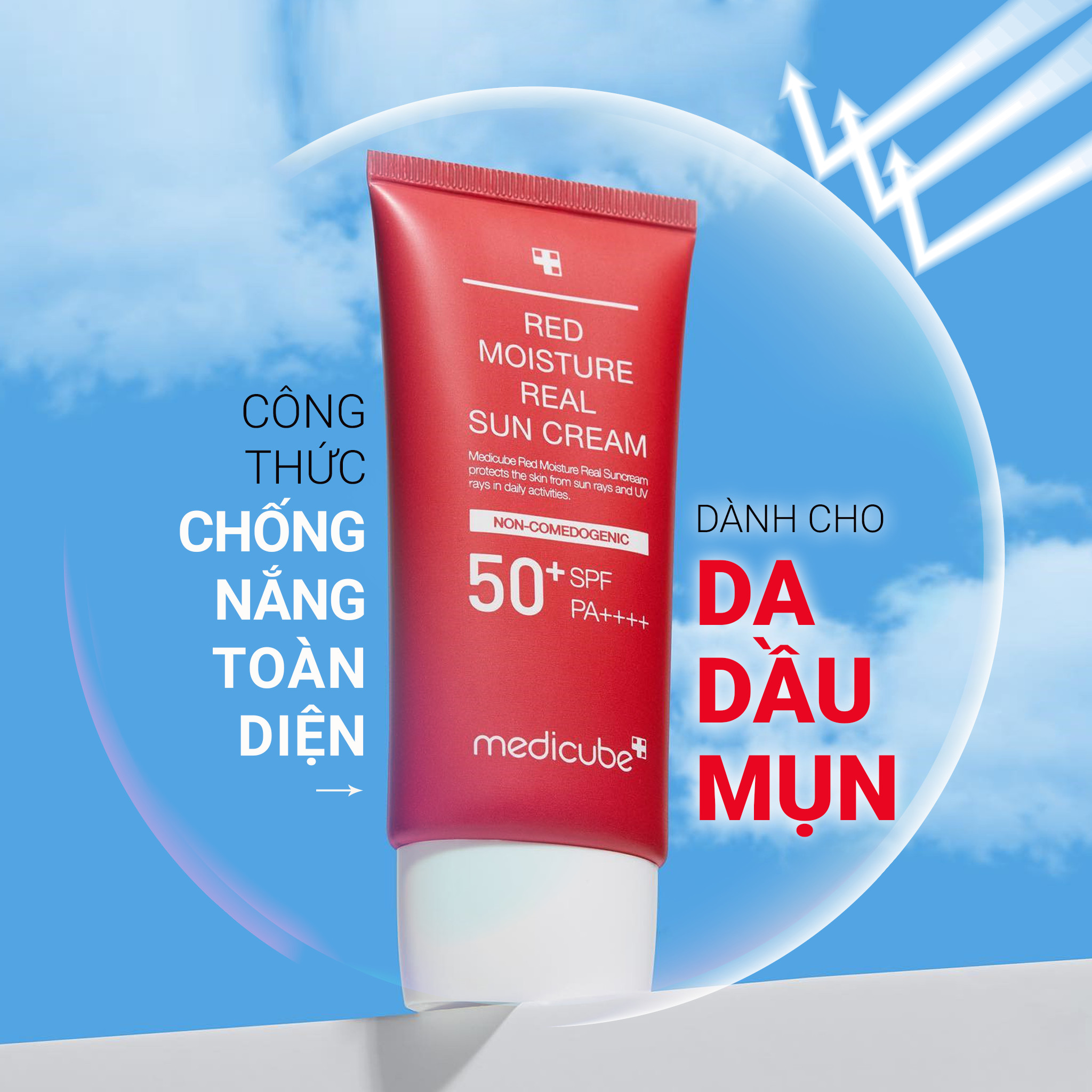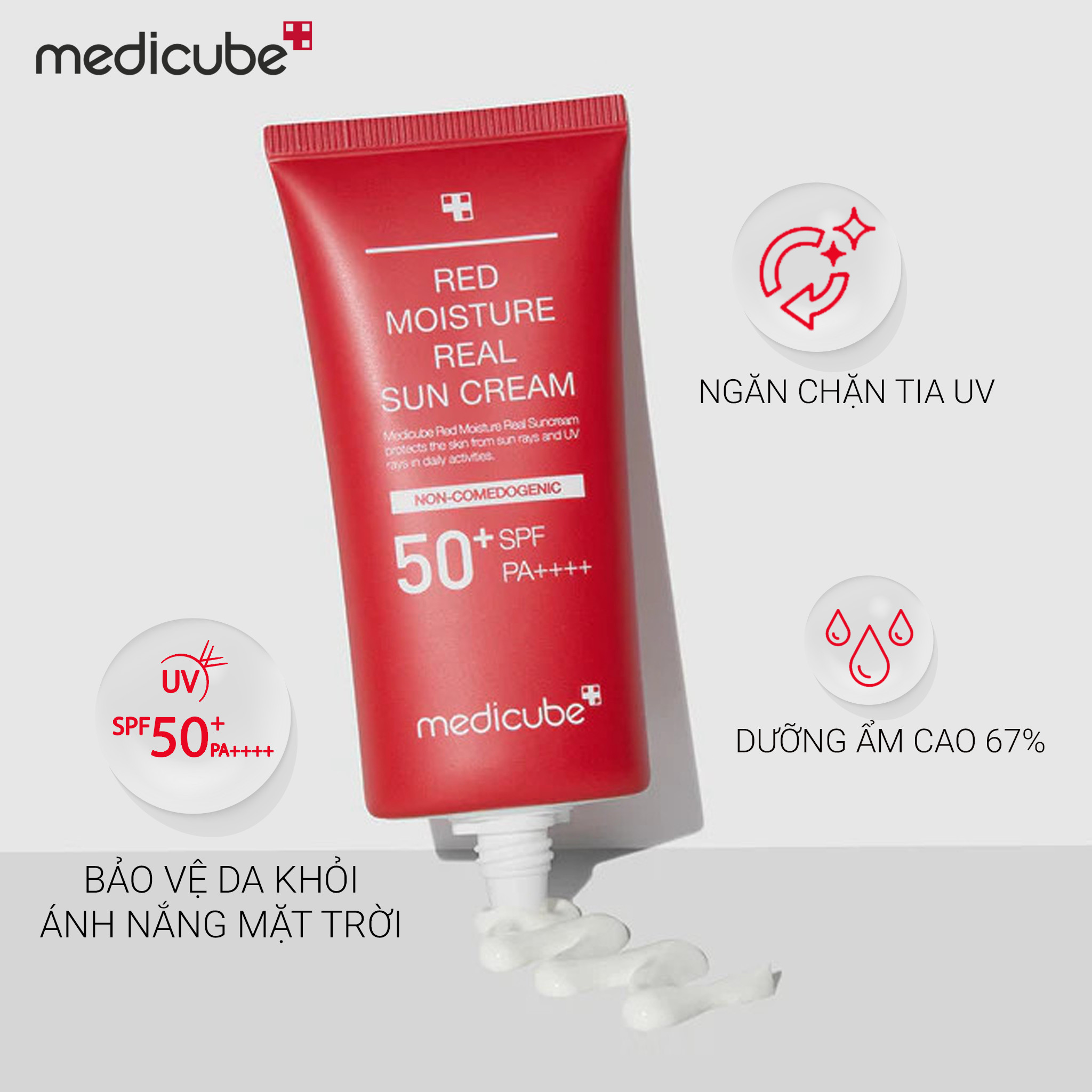 Kem Chống Nắng Dành Cho Da Mụn Medicube Red Moisture Real Sun Cream SPF50+ PA++++ là sự kết hợp tối ưu giữa các biện pháp bảo vệ vật lý và hóa học, sẽ giúp ngăn chặn tia UV và bảo vệ da khỏi ánh nắng mặt trời mà không gây kích ứng hay lưu lại vệt trắng trên da.
