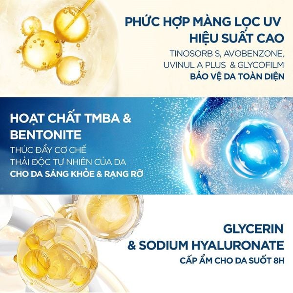 Hoạt chất TMBA (Trimethoxybenzyl Acetylsinapate) & Bentonite giúp góp phần củng cố hàng rào sinh học của da, tăng cường khả năng khả năng thanh lọc các tác nhân oxi hóa tự nhiên giúp làn da sáng khỏe rạng rỡ hơn sau 4 tuần.