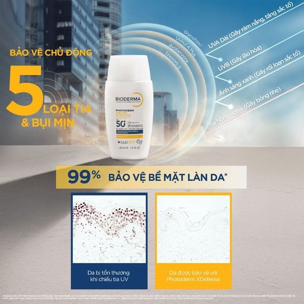 Bioderma không ngừng cải tiến cách thức bảo vệ toàn diện cho làn da khi phải đối mặt với tia UV và bụi mịn, ô nhiễm hàng ngày. Bioderma nâng cấp phức hợp màng lọc hiệu suất cao Tinosorb S, Avobenzone, Uvinul A Plus và màng Glycofilm tạo lớp màng vật lý bảo vệ da khỏi 5 loại tia và ô nhiễm giúp hạn chế sự bám dính của các tác nhân ô nhiễm từ môi trường (bụi mịn, kim loại nặng,..)