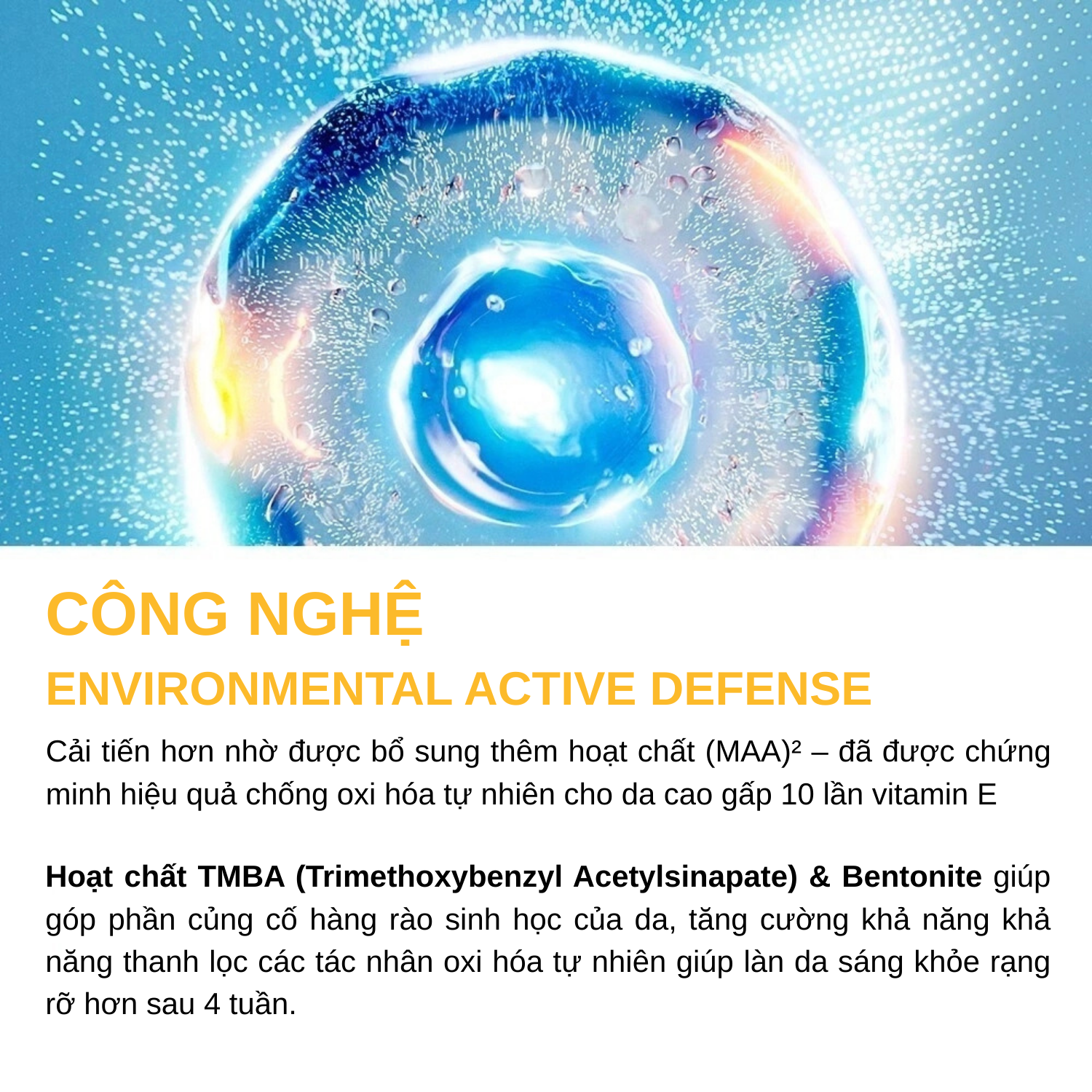 Công nghệ Environmental Active Defense cải tiến hơn nhờ được bổ sung thêm hoạt chất (MAA)² – đã được chứng minh hiệu quả chống oxi hóa tự nhiên cho da cao gấp 10 lần vitamin E
