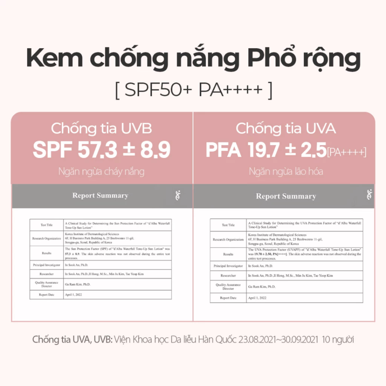 Kem Chống Nắng Nâng Tone Tự Nhiên d'Alba Waterfull Tone Up Sun Cream SPF50+ PA++++ 50ml là kem chống nắng vật lí lai hóa học giúp nâng tone tự nhiên, tạo lớp nền cho làn da căng bóng tự nhiên mà còn bảo vệ da khỏi tia UVB & UVA.