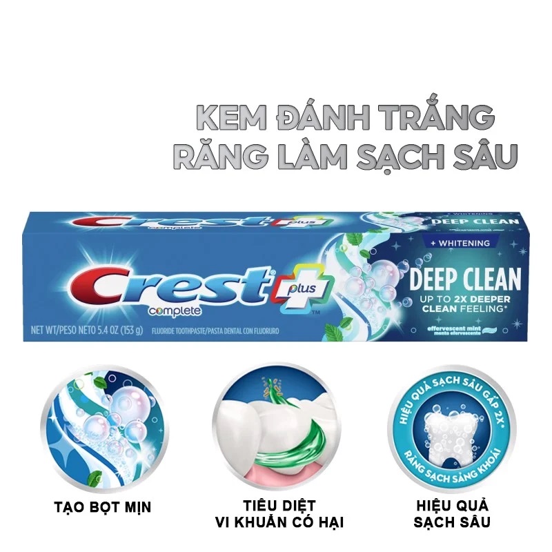 Kem Đánh Trắng Răng Làm Sạch Sâu Crest Complete Whitening + Deep Clean là dòng sản phẩm chăm sóc răng miệng đến từ thương hiệu Crest của Mỹ. Tạo bọt mịn cùng với làm sạch sâu gấp 2X mang lại cảm giác sảng khoái giúp bạn tự tin.