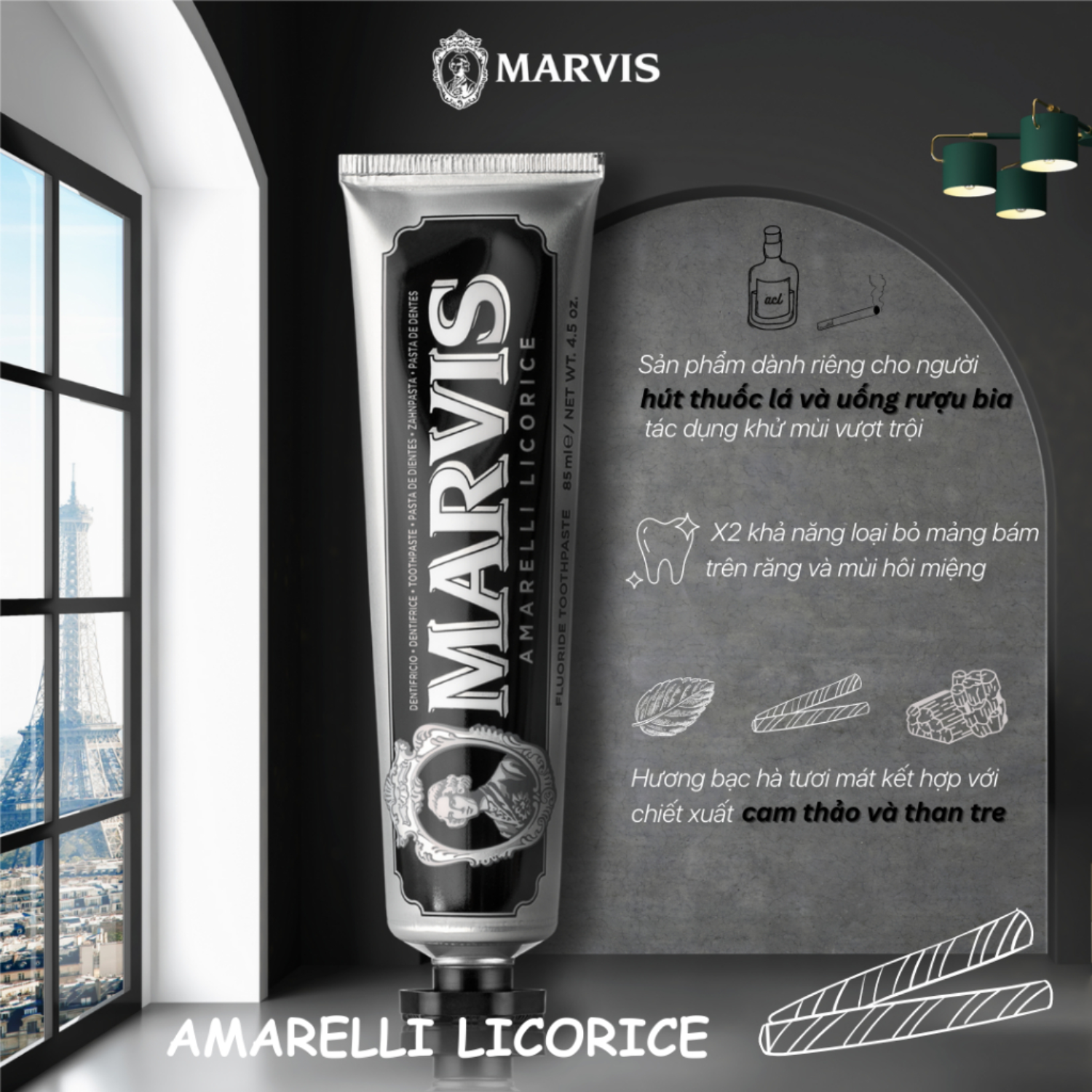 Marvis Smokers Whitening Mint (Cho người hút thuốc): Sở hữu công thức Plasdone giúp loại bỏ các bẩn cứng đầu bám trên bề mặt răng, mà không gây kích ứng hoặc ăn mòn quá mức men răng. Hương thơm bạc hà đậm đặc mang lại cho bạn cảm giác thơm tho, tươi mát, dành cho người thường xuyên sử dụng cà phê, trà, thuốc lá.