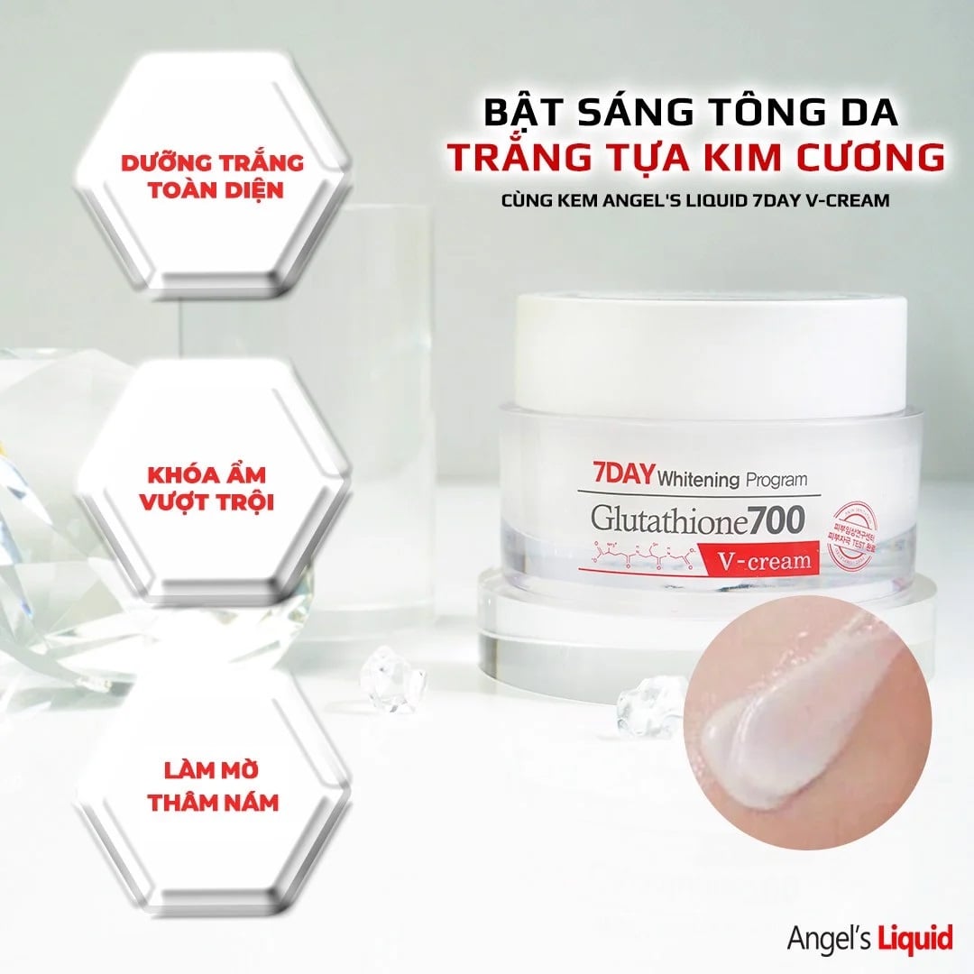 Kem Dưỡng Angel's Liquid Làm Sáng Da, Mờ Thâm 50ml là sản phẩm kem dưỡng đến từ thương hiệu Angel's Liquid của Hàn Quốc, có chứa nano L-Glutathione dưỡng da trắng sáng, xóa mờ thâm, sạm nám, làm đều màu da, tăng cường chống oxy hóa. Kết hợp Niacinamide và Sodium Hyaluronate (HA) thu nhỏ lỗ chân lông, kiểm soát tình trạng dầu mụn, tăng sinh collagen và elastin giúp ngừa lão hóa, đồng thời cấp ẩm sâu giúp da căng bóng chuẩn Hàn. Hiệu quả sau 7 ngày sử dụng đã được kiểm chứng bởi viện nghiên cứu da Hàn Quốc.
