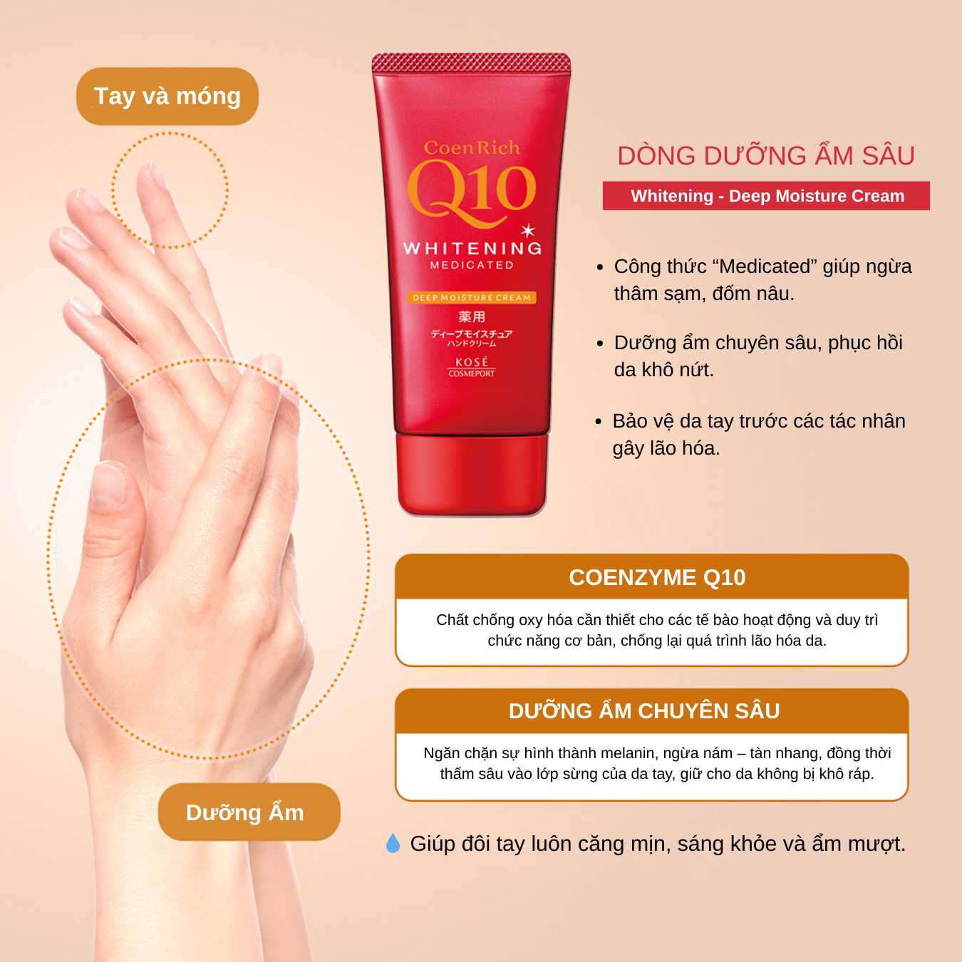Đôi tay không chỉ là “trợ thủ” trong công việc hằng ngày mà còn thể hiện nét đẹp và sự chăm chút của mỗi người. Thế nhưng, tiếp xúc thường xuyên với nước, hóa chất hay điều kiện thời tiết khắc nghiệt dễ khiến da tay khô ráp, nứt nẻ và lão hóa sớm. Kem Dưỡng Da Tay Kose Coen Rich Q10 Deep Moisture Cream 80g chính là “bí quyết” để bạn lấy lại làn da tay mềm mại, mịn màng và tươi trẻ. Với công thức giàu dưỡng chất kết hợp Coenzyme Q10 cùng các thành phần cấp ẩm chuyên sâu, sản phẩm không chỉ dưỡng ẩm tức thì mà còn hỗ trợ cải thiện độ đàn hồi, mang đến đôi tay mượt mà và sáng khỏe hơn mỗi ngày.