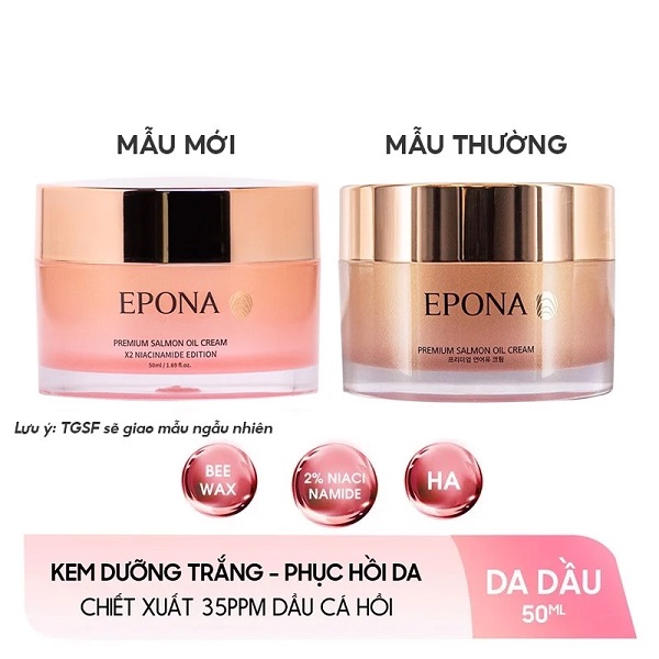 Kem Dưỡng Epona Premium Salmon Oil Cream là sản phẩm kem dưỡng chăm sóc da mặt cao cấp đến từ thương hiệu EPONA của Hàn Quốc, sở hữu các công dụng vượt trội chỉ trong một lọ kem duy nhất: dưỡng ẩm, dưỡng sáng da, hỗ trợ phục hồi hư tổn và cải thiện các dấu hiệu lão hóa. Công thức nổi bật với chiết xuất dầu Cá Hồi cô đặc, kết hợp cùng các dưỡng chất như Hyaluronic Acid, Niacinamide, Bơ Hạt Mỡ... giúp nuôi dưỡng làn da khỏe mạnh rạng ngời. Đặc biệt, sản phẩm không chứa 8 thành phần có khả năng gây hại cho da, phù hợp với mọi loại da, đặc biệt là da tổn thương sau mụn, kích ứng, không đều màu.