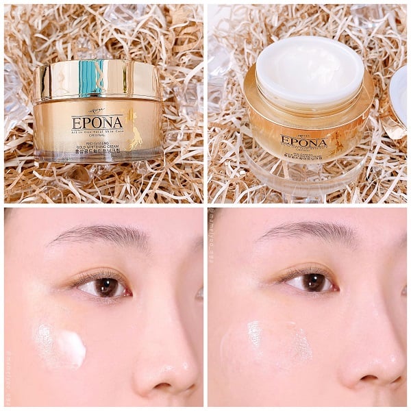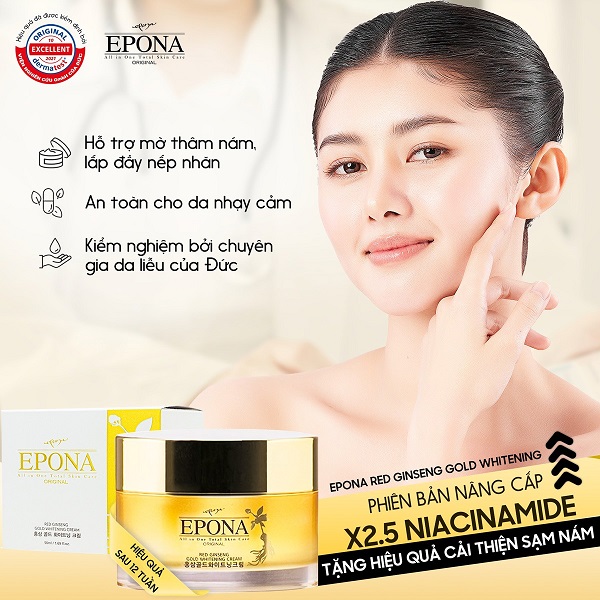 Kem Dưỡng Epona Ngừa Nám, Mờ Nhăn Chiết Xuất Hồng Sâm Red Ginseng Gold Whitening Cream 50ml là dòng kem dưỡng đến từ thương hiệu mỹ phẩm Epona của Hàn Quốc, với chiết xuất chính từ hồng sâm giúp làm mờ các đốm nâu như tàn nhang, nám, đồi mồi,... hiệu quả. Ngoài ra sản phẩm còn chứa các thành phần từ vàng 24K, Hoa Thủy Tiên và Niacinamide giúp cải thiện da tối ưu giúp da căng khỏe, ngăn ngừa tình trạng nếp nhăn, lão hóa trên da.