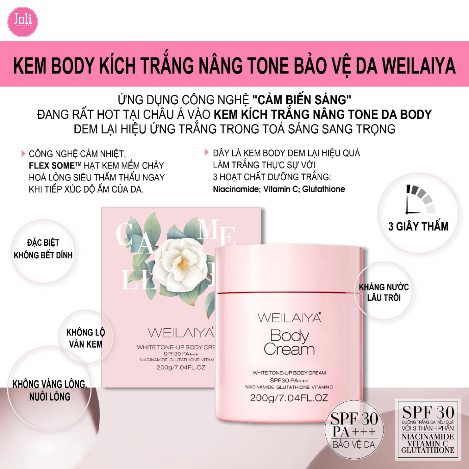 Công thức chống nắng bảo vệ da toàn diện, kem mềm mịn thẩm thấu nhanh chóng, mang lại những trải nghiệm tuyệt vời. Rất nhiều người đang tự ti vì làn da body không được đều màu và trắng sáng. Có quá nhiều nguyên nhân gây ra tình trạng thâm sạm da, cháy nắng, đồi mồi,... trong khi đó, việc dưỡng trắng toàn thân không phải là điều dễ dàng.Nếu bạn đang bế tắc trên con đường dưỡng trắng body thì Dưỡng thể Weilaiya White Tone Up Body Cream chính là “vị cứu tinh” cho làn da của bạn.Dưỡng thể trắng da Weilaiya White Tone Up Body Cream có công thức kết hợp 3 hoạt chất làm trắng: Niacinamide, Glutathione và Vitamin C làm sáng bừng làn da, trị thâm sạm, chống oxy hóa.