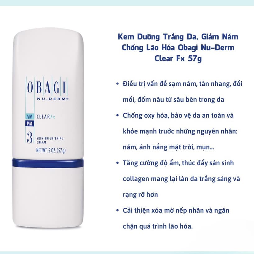 Kem làm sáng da, chống lão hóa Obagi Nu-Derm Clear Fx với công thức chứa Arbutin được chiết xuất từ quả việt quất giúp cải thiện các tình trạng như nám, đốm nâu, đồi mồi, các vết cháy nắng hay vết thâm sau mụn. Công thức còn được bổ sung thêm các hoạt chất chống oxy hóa mạnh mẽ như Vitamin C, Vitamin E, hỗ trợ bảo vệ da bằng cách ngăn chặn quá trình hình thành thâm nám. Bên cạnh đó thành phần Lactic acid (AHA) sẽ loại bỏ các vết thâm sạm, làn da đã bị xỉn màu, giúp lấy lại vẻ sáng mịn, tươi mới cho làn da.