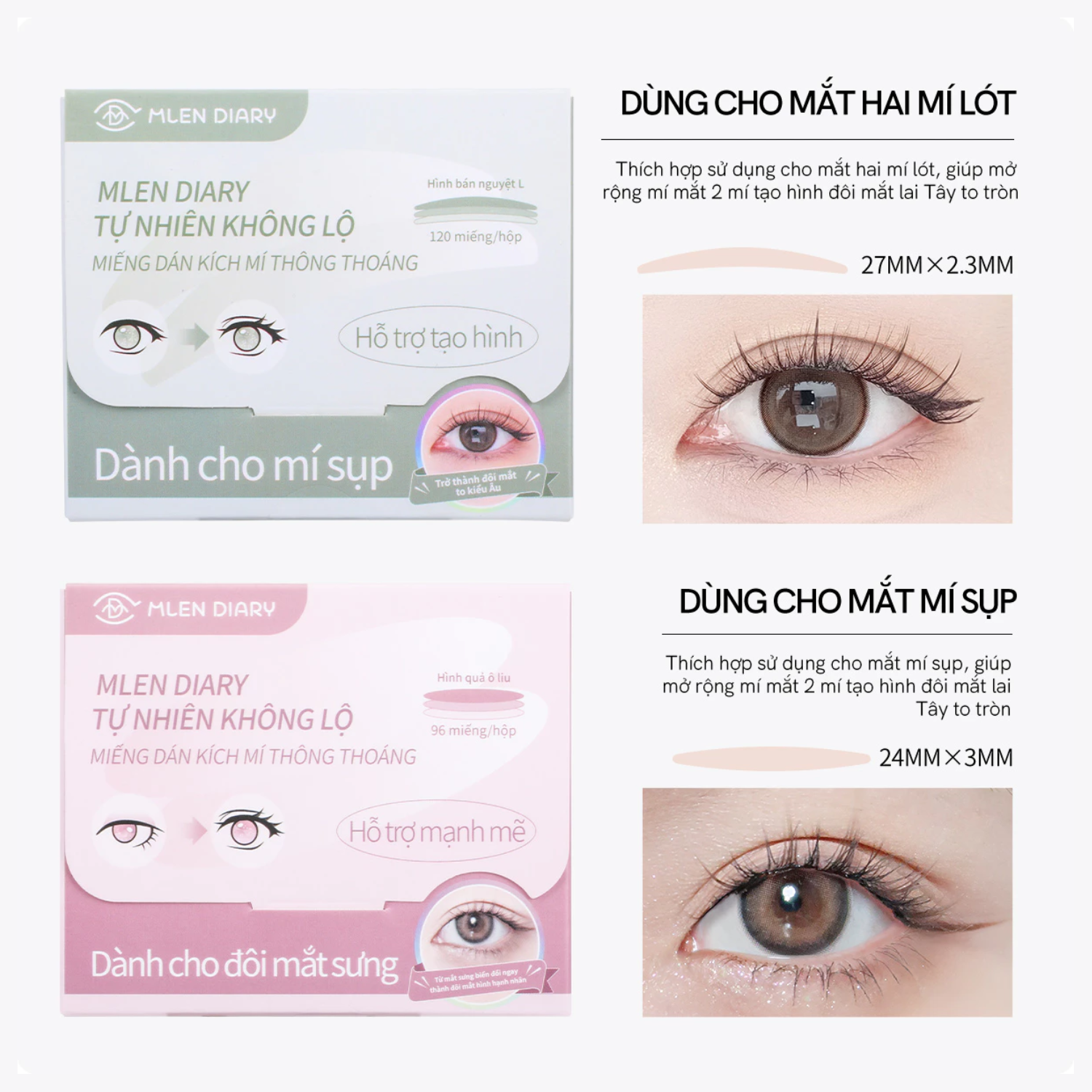 Miếng Dán Kích Mí, Phù Hợp Với Nhiều Dáng Mắt Mlen Diary là sản phẩm kích mí đến từ thương hiệu Mlen Diary. Sản phẩm giúp tạo đường mí mắt tự nhiên, giúp mắt trong to tròn và rõ nét hơn. Với thiết kế siêu mỏng chỉ 0.08mm giúp hỗ trợ kích mí tốt, không gây nặng mắt, không để lại keo thừa và có độ bám chắc chắn, dễ dàng sử dụng và không gây kích ứng cho da.