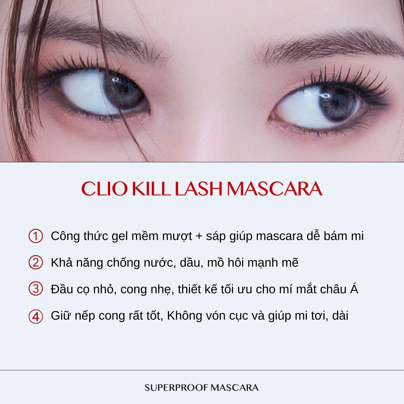 Clio Kill Lash Superproof Mascara cho hiệu quả làm cong mi từ gốc đến ngọn, kích thích mi dài và cong tự nhiên.