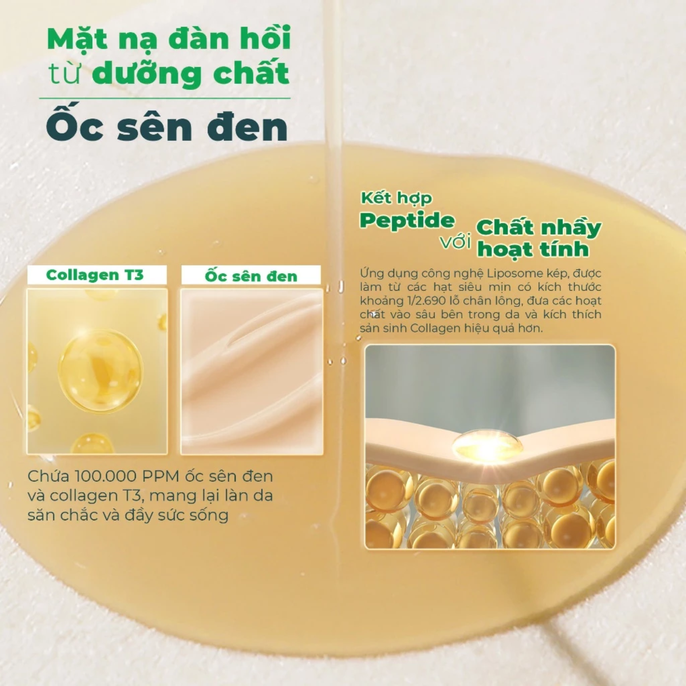 Chứa 100.000PPM ốc sên đen và collagen T3 cung cấp dồi dào dưỡng chất cho da, giúp da săn chắc và đầy sức sống