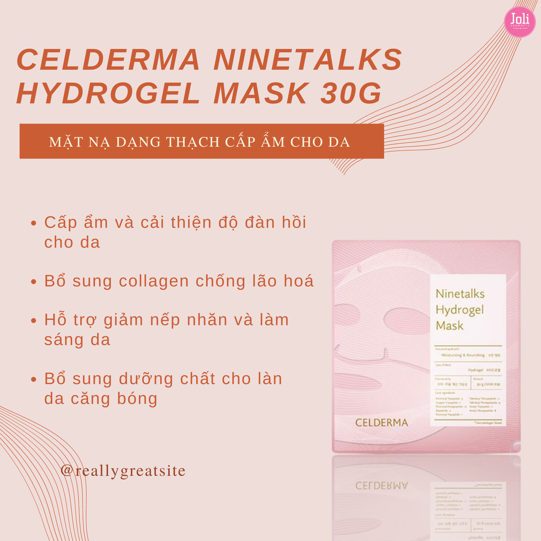 Mặt Nạ Thạch Sinh Học Cấp Ẩm, Căng Bóng Da Celderma Ninetalks Hydrogel Mask là mặt nạ giúp cấp ẩm và cải thiện độ đàn hồi của da với 9 loại Peptide và thành phần Fructant được cấp bằng sáng chế giúp bổ sung độ ẩm cà cải thiện độ đàn hồi cho da thuộc thương hiệu Celderma đến từ Hàn Quốc. Giúp bổ sung collagen thủy phân cho da mặt, giúp cho da mặt có thể trắng sáng và căng mịn, tràn đầy sức sống. Làm tăng lưu thông máu trên da, giúp hồi phục các hư hại và làm đầy các rãnh nhăn.