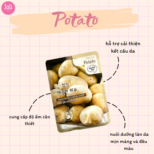 - Chiết xuất khoai tây giúp cung cấp độ ẩm cần thiết mà không làm da bị bết dính, hỗ trợ cải thiện kết cấu da và nuôi dưỡng cho làn da sáng mịn đều màu hơn.