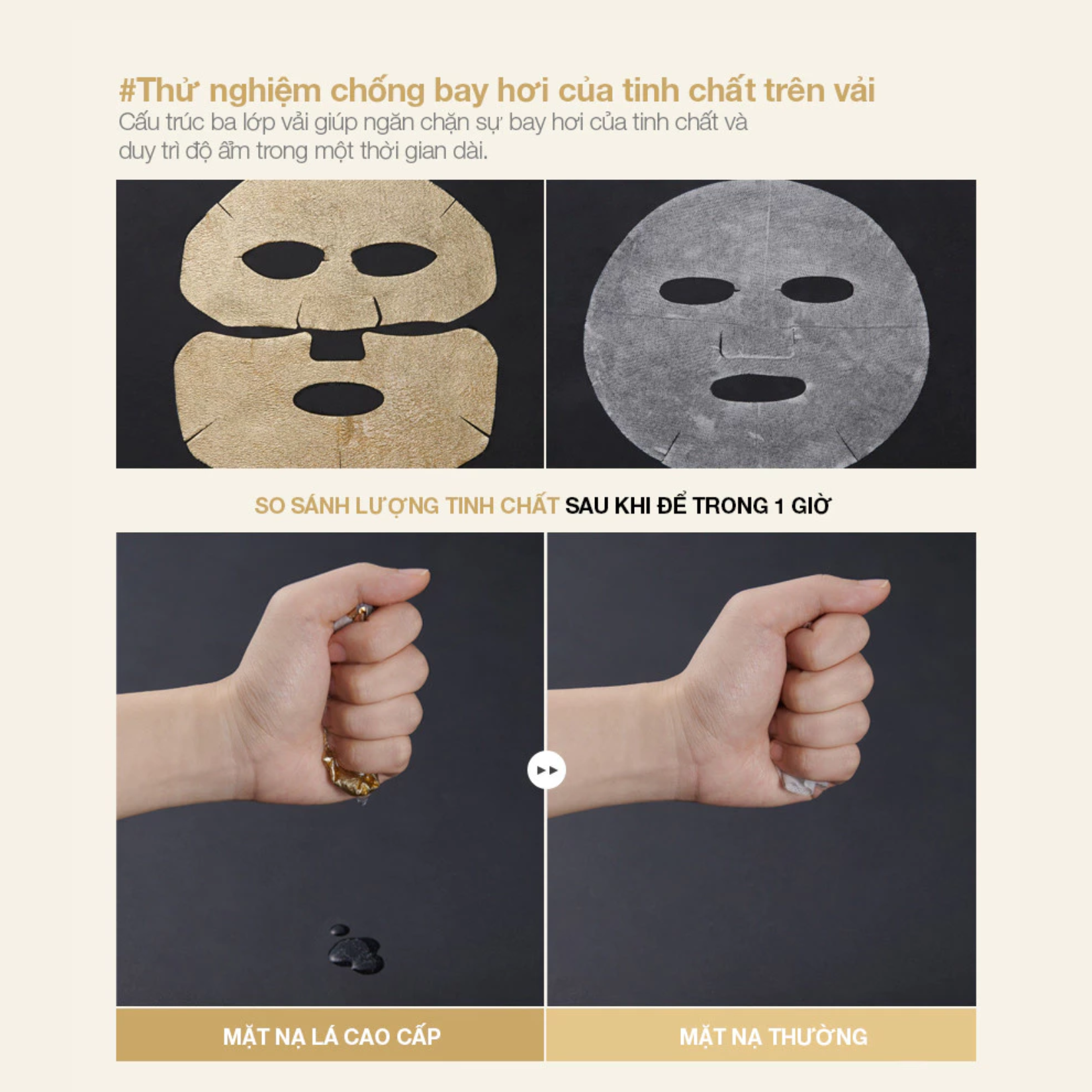 - Mặt nạ lá có cấu trúc ba lớp tiếp xúc với không khí bên ngoài để ngăn tinh chất bay hơi và tăng cường khả năng hấp thụ tối đa dưỡng chất.
