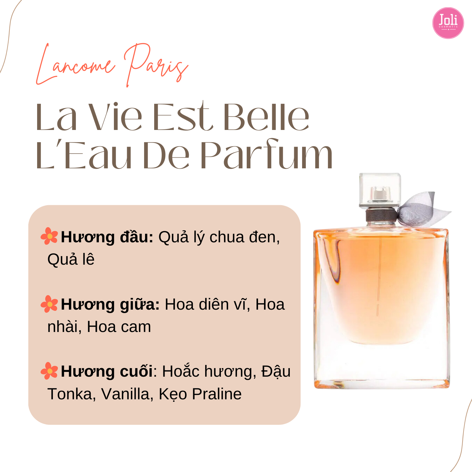 Lancôme La Vie est belle là sự hòa quyện giữa hương nồng nàn, thanh khiết của hoa Iris, hoa Cam, hoa Nhài, sự ngọt mát của trái cây nhiệt đới: Nho đen, Lê và nốt hương cuối ấm nồng của Hạnh nhân, đậu Tonka, Praline, Hoắc hương và Vani. Tất cả quyện hòa tạo nên mùi hương ngọt ngào, gợi nhớ về cuộc sống tươi đẹp và êm ả.