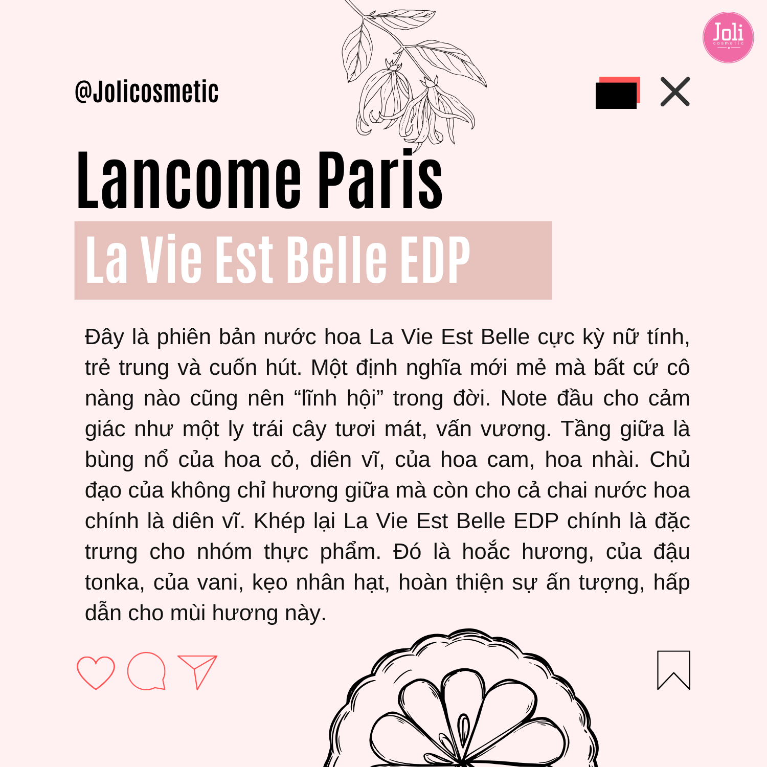 “La vie est belle”, trong tiếng Pháp nghĩa là “Cuộc sống tươi đẹp“; một bản tuyên ngôn cho thời đại mới, lan tỏa niềm hạnh phúc của bản thân và khơi gợi xúc cảm cho tất cả mọi người. Nồng ấm đậm nét Á Đông xen lẫn chút hương hoa và sự ngọt ngào của hương vị trái cây, nước hoa La Vie Est Belle độc đáo hơn bao giờ hết - một mùi hương phức tạp lẫn hiện đại khó quên.