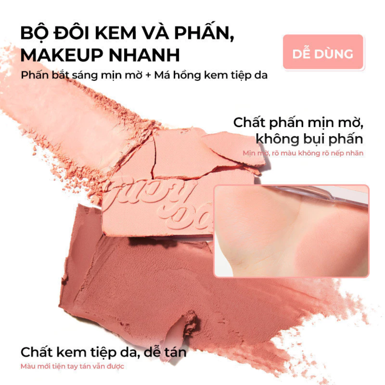 Chất phấn mịn mờ không lộ vân, không bụi, mang lại lớp nền sáng hồng, trong trẻo và trẻ trung đúng chuẩn vibe Hàn. Bảng màu dễ dùng, không kén da, phù hợp với nhiều tông da và phong cách makeup khác nhau, giúp bạn tự tin biến hóa mỗi ngày theo cách riêng.