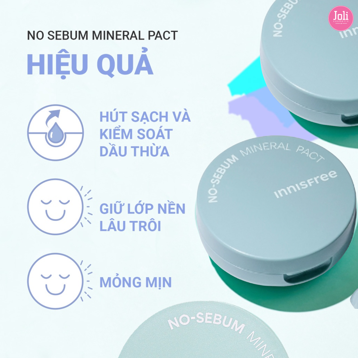 Phấn Phủ Dạng Nén Innisfree No Sebum Mineral Pact là loại phấn khoáng dạng bột, chiết xuất 100% từ bạc hà và hạt ngọc trai, có khả năng hút dầu rất tốt. Phấn chỉ có duy nhất 1 tone, nhưng đánh lên không quá trắng, mà rất dễ tiệp với tất cả các tone da. Vì phấn với thành phần 100% từ thiên nhiên, nên không có mùi hóa học, không gây kích ứng cho da, kể cả loại da hay mẩn cảm với các loại mỹ phẩm trang điểm. Tạo cảm giác thư giãn nhẹ dịu cho da, giúp kiểm soát lượng dầu nhờn, mồ hôi và điều chỉnh độ ẩm giúp da mịn màng trắng sáng