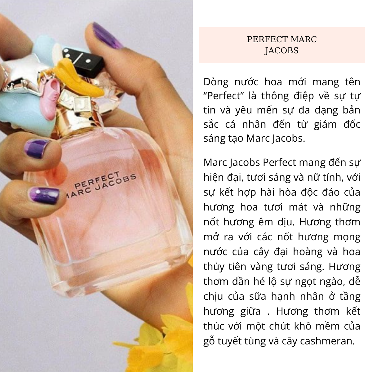Nước hoa nữ Marc Jacobs Perfect For Women là dòng nước hoa mới được ra mắt mang một mùi hương hoa cỏ dịu dàng. Marc Jacobs Perfect For Women không quá nổi trội nhưng cực kỳgây ấn tượng và vô cùng hoàn hảo cho những ai thích sự nhẹ nhàng ấm áp.