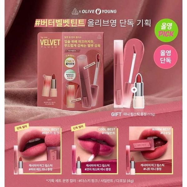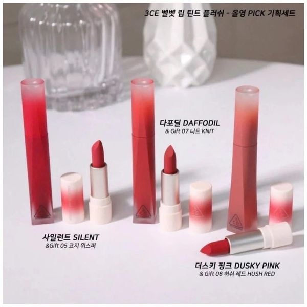 Nếu bạn đang tìm kiếm một bộ son vừa xinh xắn để dùng, vừa có thể làm quà tặng thì Set Son 3CE Lip Tint Velvet Plush chính là lựa chọn không thể bỏ qua. Bộ sản phẩm sở hữu chất son velvet mềm mịn đặc trưng của 3CE, thiết kế tinh tế và lên màu cực chuẩn. Đặc biệt, set gồm hai phiên bản màu “đốn tim” mọi cô gái: