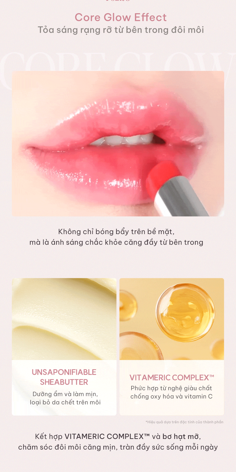 Hiệu Ứng Sáng Từ Bên Trong (Core Glow Effect): Giúp đôi môi tỏa sáng rạng rỡ từ bên trong, mang lại vẻ ngoài căng mọng, bóng khỏe.