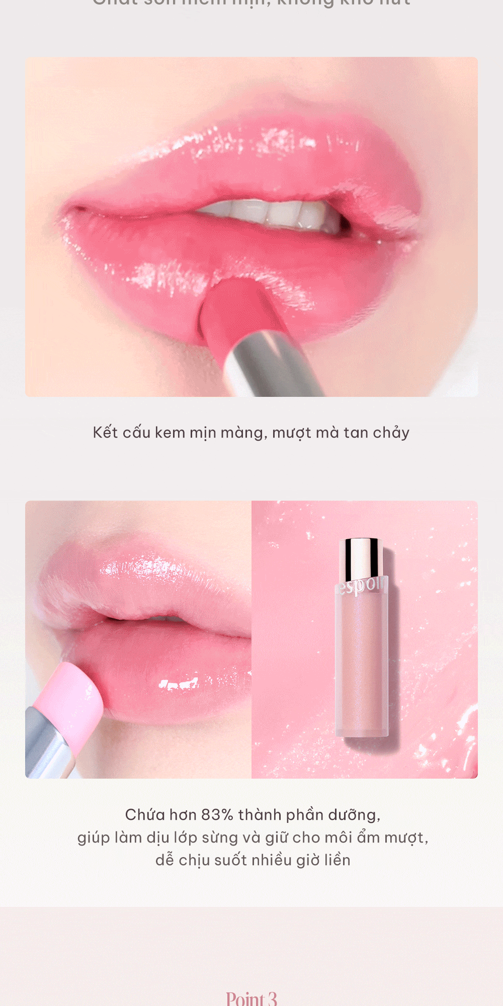 Khóa Ẩm (Moisture Lock-in): Chất son mềm mịn, không gây khô nứt, giúp khóa ẩm hiệu quả, duy trì độ ẩm lý tưởng cho môi.