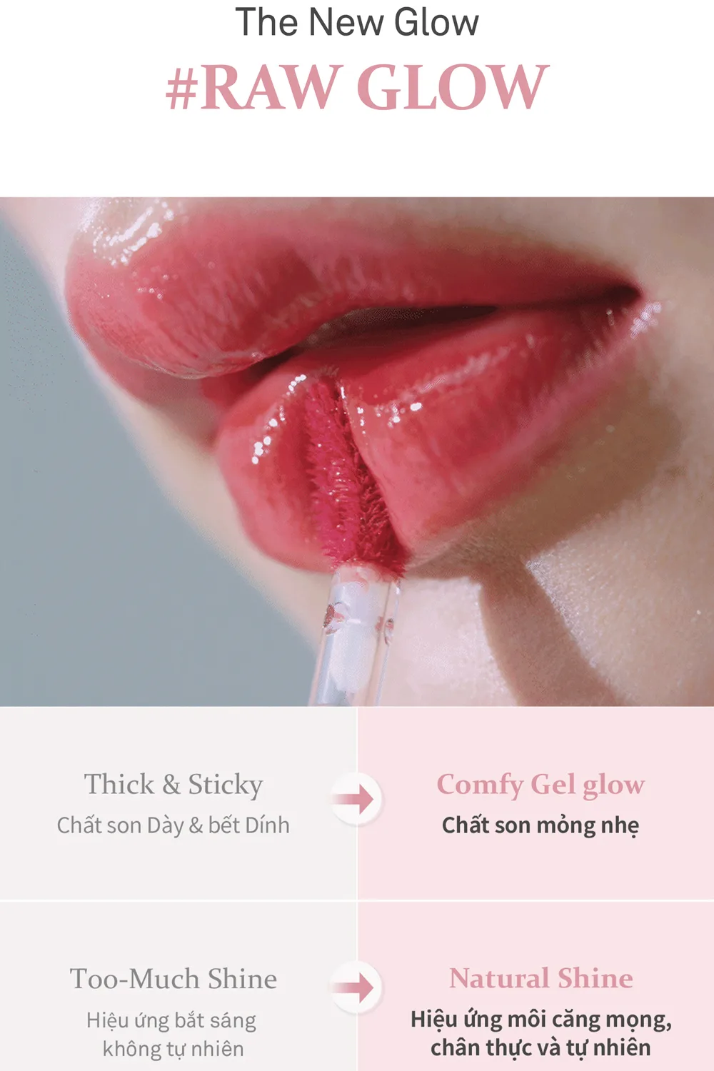 Lấy cảm hứng từ sự lấp lánh của nguyên liệu thô, Raw Glow Gel Tint mang lại hiệu ứng môi căng bóng, trong suốt như đá quý. Sản phẩm cung cấp dưỡng chất chuyên sâu với thành phần dưỡng ẩm lâu dài và giảm da chết, cho đôi môi luôn căng mọng và mịn màng. Màu sắc tươi sáng, không bị ô-xy hóa, phù hợp với mọi tông da.