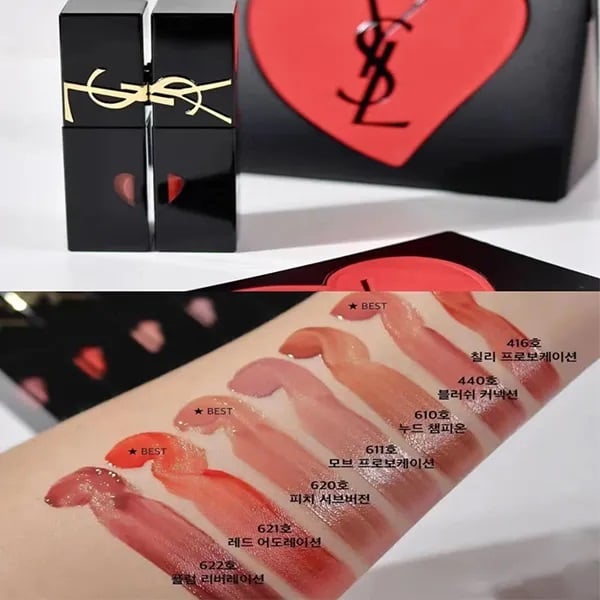 - Thiết kế: Vỏ đen sang trọng lấy cảm hứng từ trang phục Tuxedo, điểm nhấn là khung hình trái tim trong suốt giúp quan sát màu son bên trong và logo YSL mạ vàng tinh xảo.