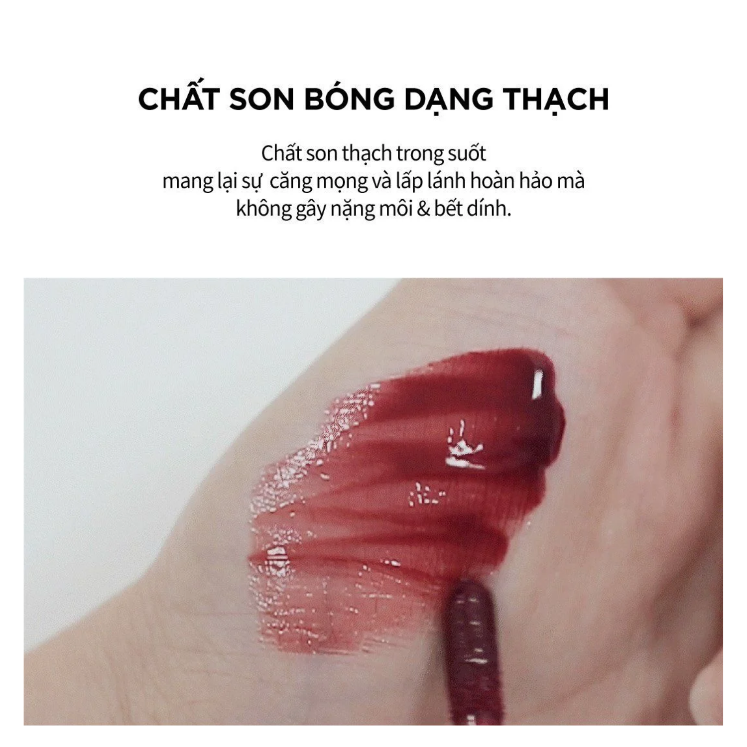 Với kết cấu son tint bóng mới với kết cấu dạng thạch, lên màu chuẩn ngay từ lần chạm cọ đầu tiên.