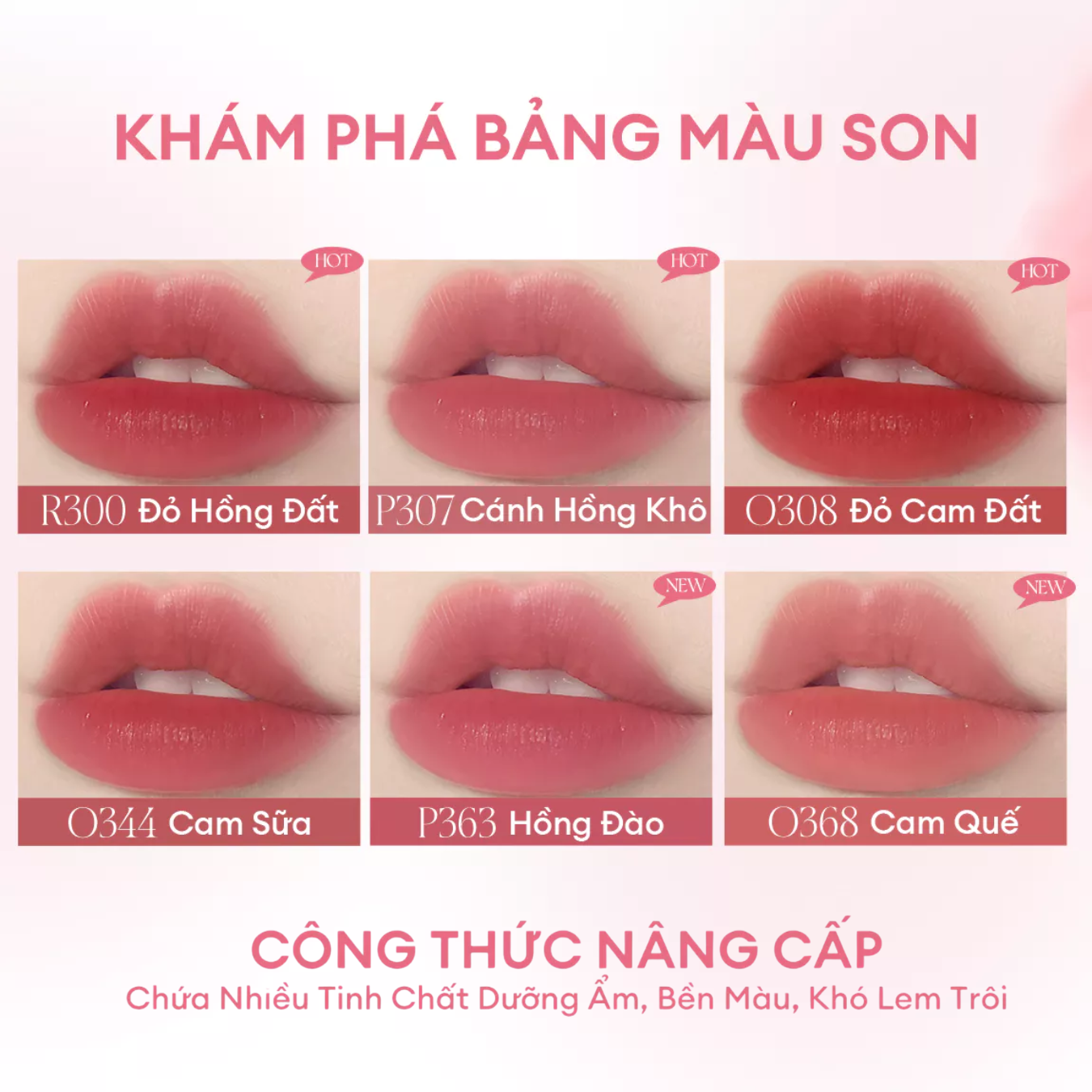 Bảng màu thời thượng: Từ tông cam đào ngọt ngào, đỏ đất quyến rũ đến hồng MLBB tự nhiên – dễ chọn, dễ phối, phù hợp mọi phong cách.