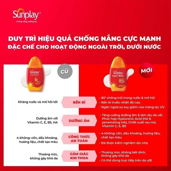 Sữa Chống Nắng Sunplay Super Block SPF50+ PA++++ đến từ thương hiệu Sunplay của Rohto-Mentholatum là giải pháp bảo vệ da tối ưu với chỉ số SPF81 và PA++++, chống lại tia UVA/UVB vượt trội. Sản phẩm lý tưởng cho chống nắng da mặt và toàn thân, đặc biệt phù hợp khi đi biển, bơi lội, du lịch hay thể thao.
