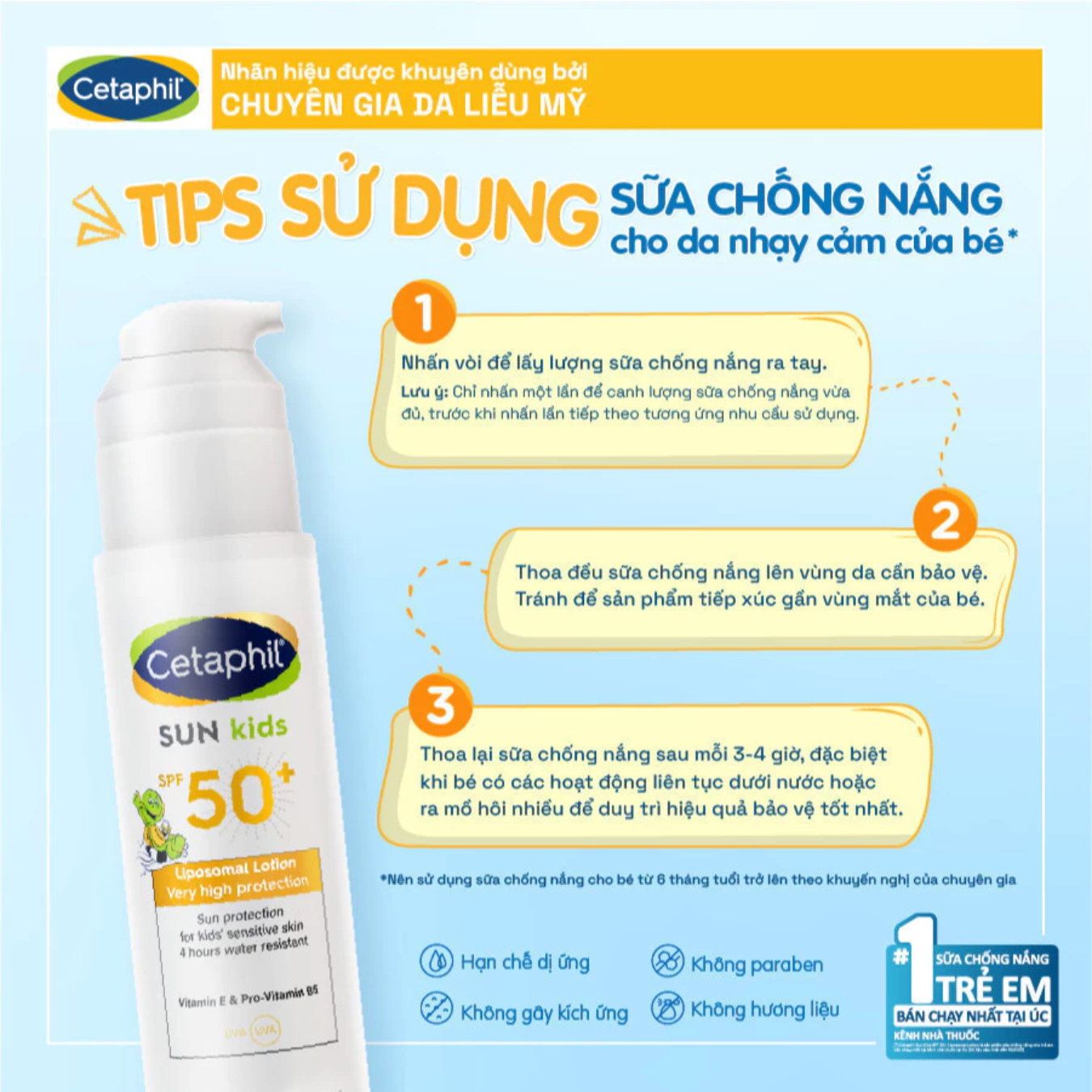 Cetaphil Sun Kids SPF 50+ Liposomal Lotion phổ rộng có khả năng chống nắng cho làn da nhạy cảm của bé với khả năng bảo vệ rất cao.