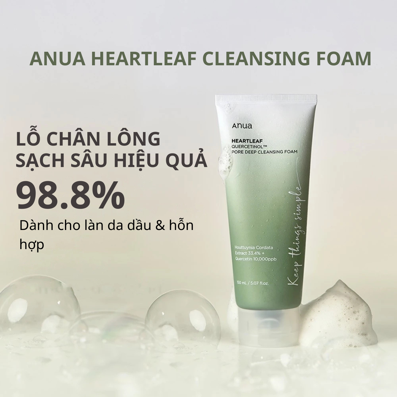 Sữa Rửa Mặt Anua Heartleaf Quercetinol Pore Deep Cleansing Foam với lớp bọt mịn, dày cùng thành phần chứa bột Diếp cá cùng BHA để làm sạch sâu trong lỗ chân lông. mang lại cảm giác sạch sâu, sảng khoái và thông thoáng.