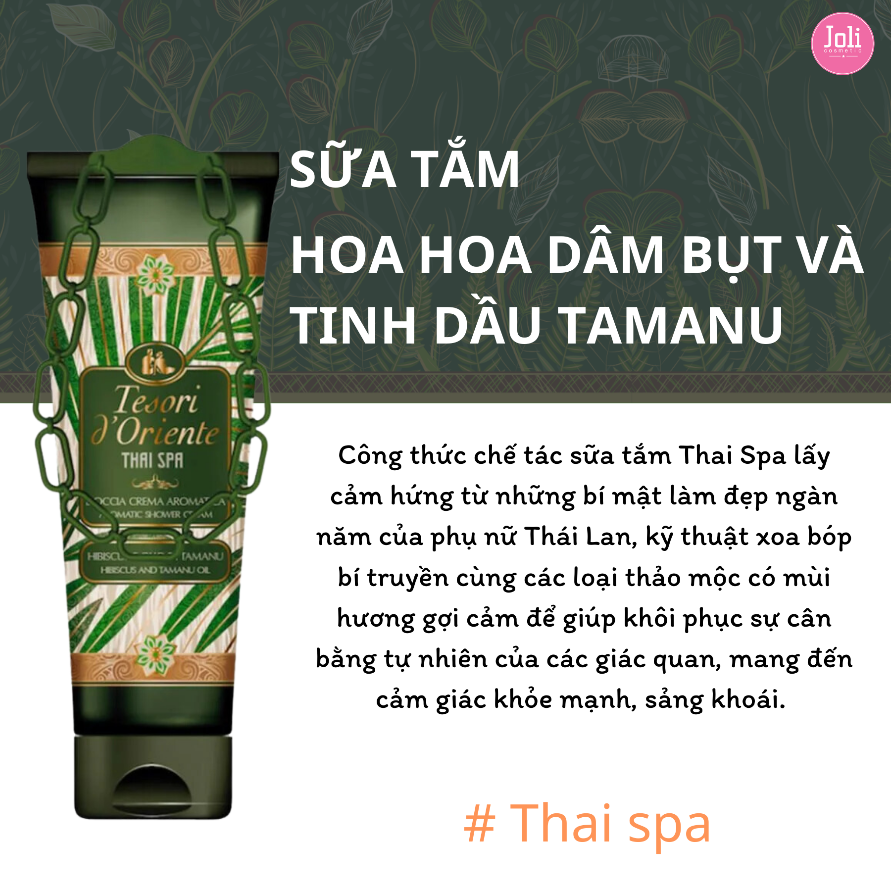 Sữa Tắm Nước Hoa Tinh Chất Hoa Dâm Bụt Và Tinh Dầu Tamanu Tesori D'Oriente Thai Spa Bath Cream được lấy cảm hứng từ kỹ thuật xoa bóp bí truyền của Thái Lan kết hợp với nhiều loại thảo mộc quý hiếm với hương thơm gợi cảm, tạo cảm giác thư giãn sau một ngày làm việc. Thành phần chủ yếu của sữa tắm được chiết xuất từ hoa dâm bụt và tinh dầu Tamanu giúp làm sạch, dưỡng ẩm và tái tạo làn da từ sâu bên trong. Bạn sẽ sở hữu một làn da mềm mịn, ẩm mượt với hương thơm quyến rũ.