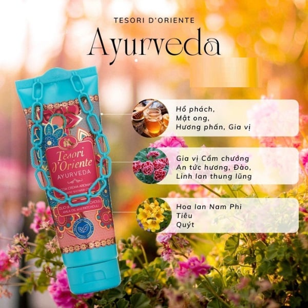 Sữa Tắm Nước Hoa Ayurveda Tesori D'Oriente Ayurveda Bath Cream có chứa thành phần chiết xuất từ cây dược liệu amla oil. Chiết xuất này giàu các dưỡng chất như vitamin C, axit béo cùng các khoáng chất có lợi cho làn da. Sản phẩm có chứa công thức chăm sóc đặc biệt Ayurveda với các loại thảo mộc.